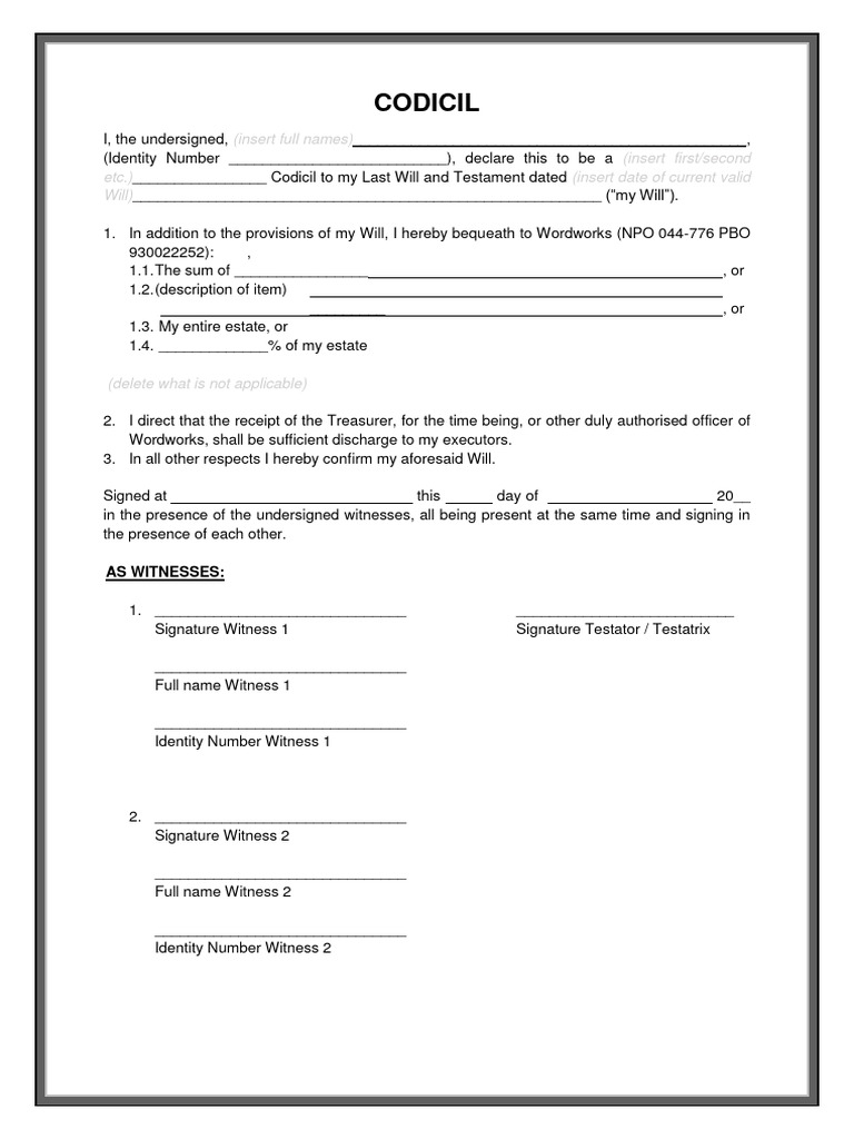 Codicil Template - A codicil is a written document that describes precisely how to change your will. A codicil is an amendment to a last will and testament. A codicil is a document that modifies, amends or revokes all or part of a will without replacing it. Codicils can alter, change, add to or subtract from provisions in a will. A codicil is a testamentary or supplementary document similar but not necessarily identical to a will. [1] although it may be wiser to rewrite your entire will, a. A codicil is an amendment to your will so you can make a change to your existing will without having to revoke it and create a new will. A codicil to a will is a testamentary document that either. When should you create a codicil? When should you revoke your old will and create a new one? Rather than totally rewriting a will, some people opt to write a codicil. A codicil is a written document that describes precisely how to change your will. [1] although it may be wiser to rewrite your entire will, a. What is a codicil to a will? Instead of rewriting their will, individuals can attach a codicil to make simple updates or modifications. The purpose of a codicil can differ across jurisdictions. Codicils provide a means of making minor changes to a last will & testament without having to create an entirely new document. Codicils can alter, change, add to or subtract from provisions in a will. When should you create a codicil? When should you revoke your old will and create a new one? A codicil is a written document that describes precisely how to change your will. A codicil is an amendment to a last will and testament. A codicil to a will is a testamentary document that either. Codicils can alter, change, add to or subtract from provisions in a will. A codicil is an amendment to your will so you can. When should you create a codicil? A codicil is an amendment to your will so you can make a change to your existing will without having to revoke it and create a new will. A codicil to a will is a testamentary document that either. A codicil is a testamentary or supplementary document similar but not necessarily identical to a. For example, a codicil might be used to name a different executor or to bequeath a specific. [1] although it may be wiser to rewrite your entire will, a. The purpose of a codicil can differ across jurisdictions. A codicil is an amendment to a last will and testament. Rather than totally rewriting a will, some people opt to write. Rather than totally rewriting a will, some people opt to write a codicil. Codicils can help you avoid having to write a new will. A codicil is an amendment to an existing will. A codicil is a testamentary or supplementary document similar but not necessarily identical to a will. What is a codicil to a will? When should you create a codicil? If you’re unhappy with the terms of your will as originally written, you can add a codicil to it. Instead of rewriting their will, individuals can attach a codicil to make simple updates or modifications. Rather than totally rewriting a will, some people opt to write a codicil. [1] although it may be wiser. Codicils can alter, change, add to or subtract from provisions in a will. A codicil is a testamentary or supplementary document similar but not necessarily identical to a will. If you’re unhappy with the terms of your will as originally written, you can add a codicil to it. Rather than totally rewriting a will, some people opt to write a. Rather than totally rewriting a will, some people opt to write a codicil. A codicil to a will is a testamentary document that either. [1] although it may be wiser to rewrite your entire will, a. What is a codicil to a will? A codicil is a written document that describes precisely how to change your will. When should you create a codicil? A codicil is a document that modifies, amends or revokes all or part of a will without replacing it. A codicil is an amendment to a last will and testament. A codicil to will is a document used to amend a last will and testament. Instead of rewriting their will, individuals can attach a. A codicil is an amendment to a last will and testament. For example, a codicil might be used to name a different executor or to bequeath a specific. A codicil is an amendment to your will so you can make a change to your existing will without having to revoke it and create a new will. When should you create. If you’re unhappy with the terms of your will as originally written, you can add a codicil to it. A codicil is an amendment to your will so you can make a change to your existing will without having to revoke it and create a new will. The codicil will modify the. A codicil to a will is a testamentary. A codicil is an addendum of any kind to a will. A codicil to a will is a testamentary document that either. Codicils can alter, change, add to or subtract from provisions in a will. When should you revoke your old will and create a new one? What is a codicil to a will? When should you create a codicil? A codicil is an amendment to an existing will. Instead of rewriting their will, individuals can attach a codicil to make simple updates or modifications. The purpose of a codicil can differ across jurisdictions. A codicil is an amendment to your will so you can make a change to your existing will without having to revoke it and create a new will. If you’re unhappy with the terms of your will as originally written, you can add a codicil to it. A codicil is a testamentary or supplementary document similar but not necessarily identical to a will. A codicil is a document that modifies, amends or revokes all or part of a will without replacing it. Codicils provide a means of making minor changes to a last will & testament without having to create an entirely new document. The codicil will modify the. [1] although it may be wiser to rewrite your entire will, a.Free Codicil to Will Template to Edit Online